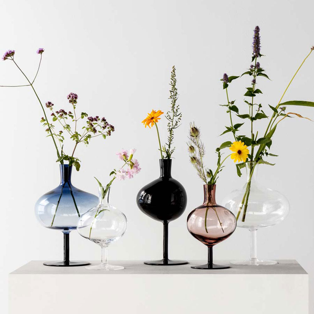 Like a tall wineglass, Bod balances confidently while its bowl captures the play of light. With their sheer and tall shape, the bottles are a piece of art that stands grounded in every home. The handmade midnight blue glass bottle on foot can be used as a decorative object, vessel, or vase.