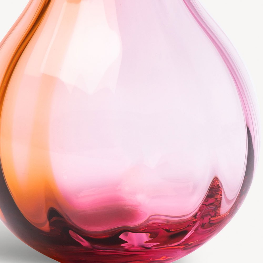 Handblown in Kosta, Sweden, the drop-shaped vases use a multi-colored underlay and optical pattern. A technique that secures variation in the thickness of the glass during the hot shop process. The result adds life and playful vividness to the glass. The vases are reminiscent of small jewelry pieces in carefully selected color pairings.