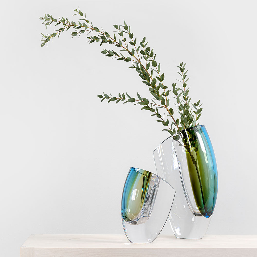 With Mirage, the artist and designer Göran Wärff found inspiration from nature and light, especially in the reflection of light and optical illusions. The object is a sculpture, a vase, and an art piece, available in a wide range of colors. To create a spectacular object like Mirage, an angled pipe is used to form its distinctive curved shape. Mirage is handmade in Kosta, Sweden, and is part of the Kosta Boda Artist Collection.
