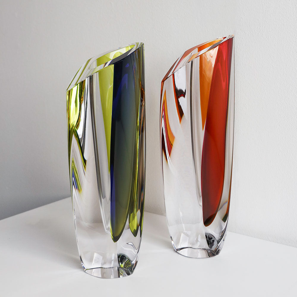 Saraband is one of many artistic creations by the legendary glass artist Göran Wärff, who worked with Kosta Boda for decades. The vibrant colors and the sharp edges give the object a dramatic expression. Saraband is handmade at Kosta Glassworks in Sweden by using a free-hand technique, which makes each vase unique. The magnificent Saraband is a sculpture, a vase, and an art piece, part of the Kosta Boda Artist Collection.