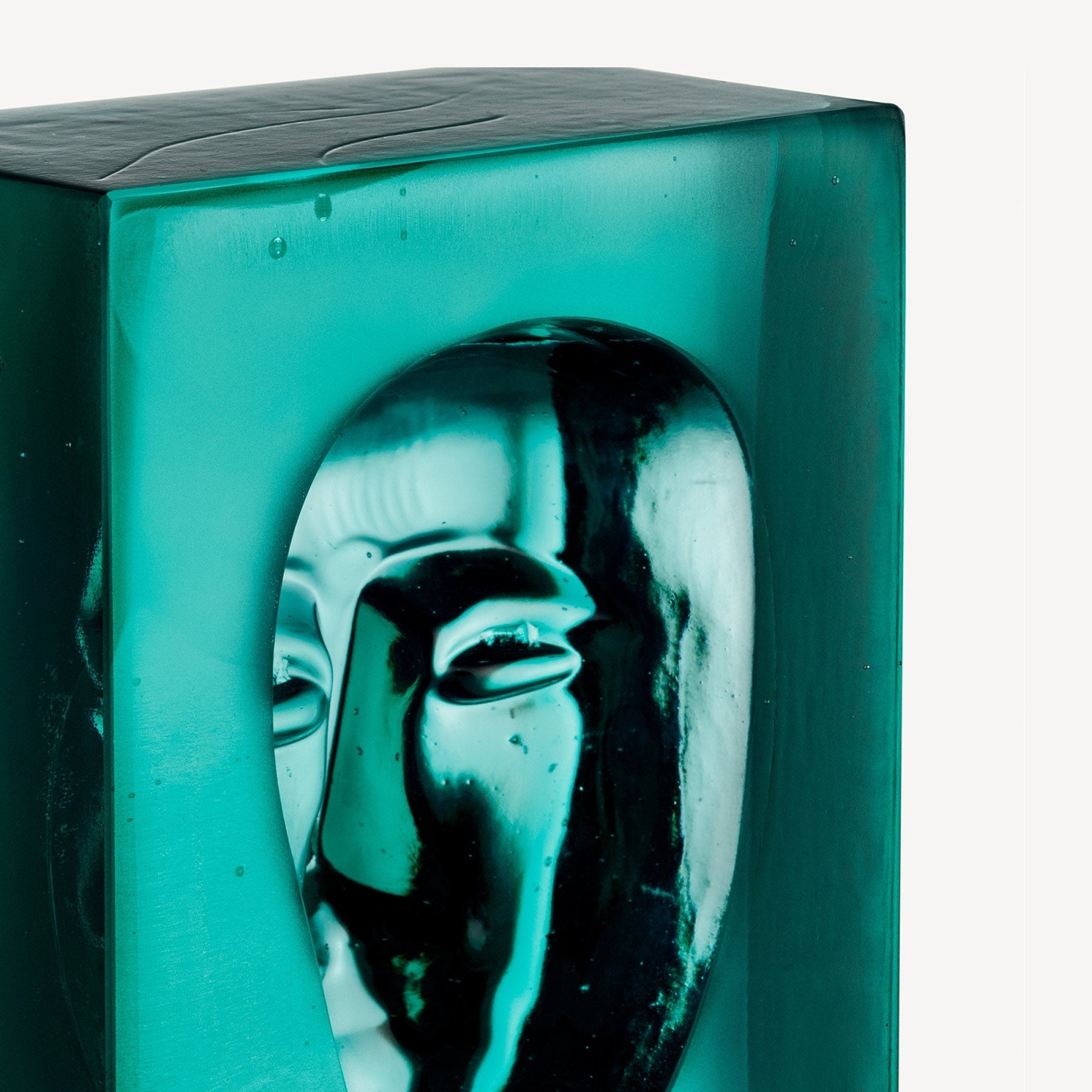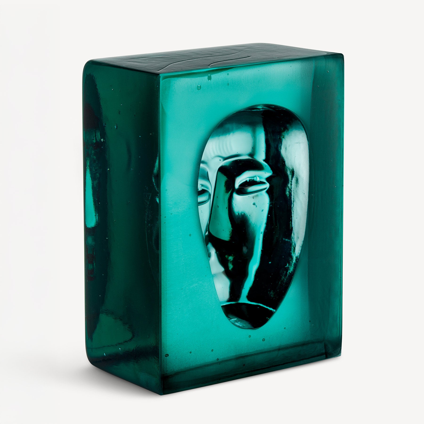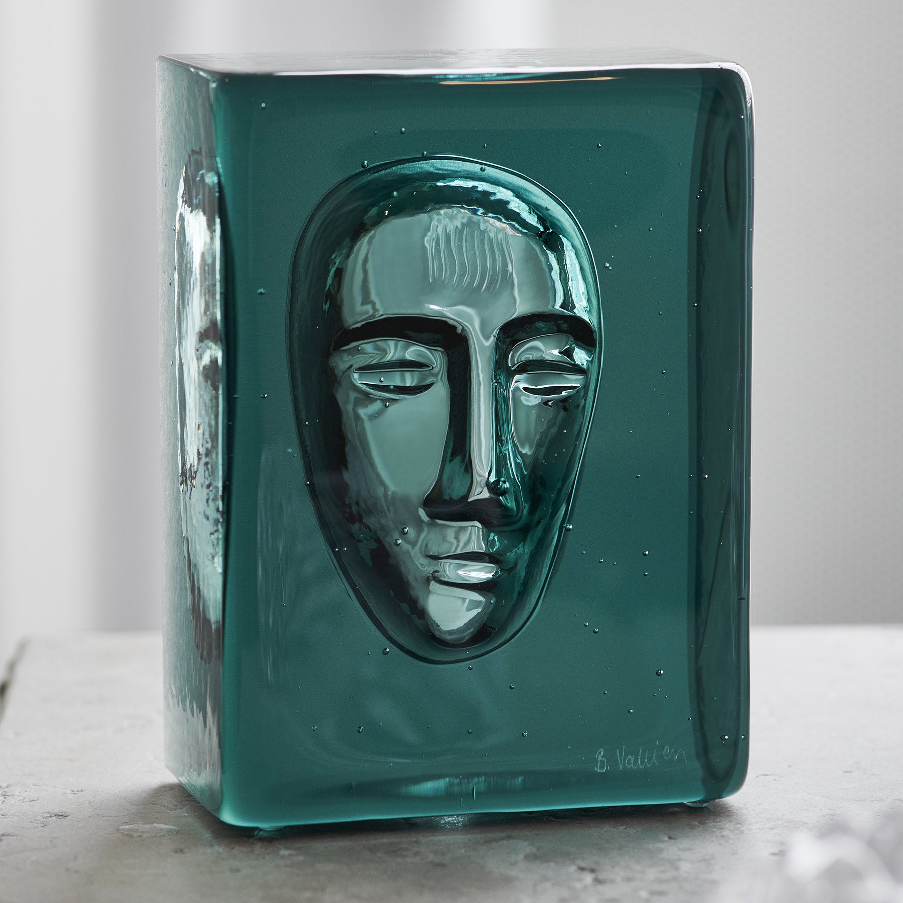 Azur Man Petrol, by Bertil Vallien, is part of the Kosta Boda Artist Collection. This object in petroleum blue is cast in a graphite mold. The mold creates an impression of one of Bertil Vallien’s characteristic faces.