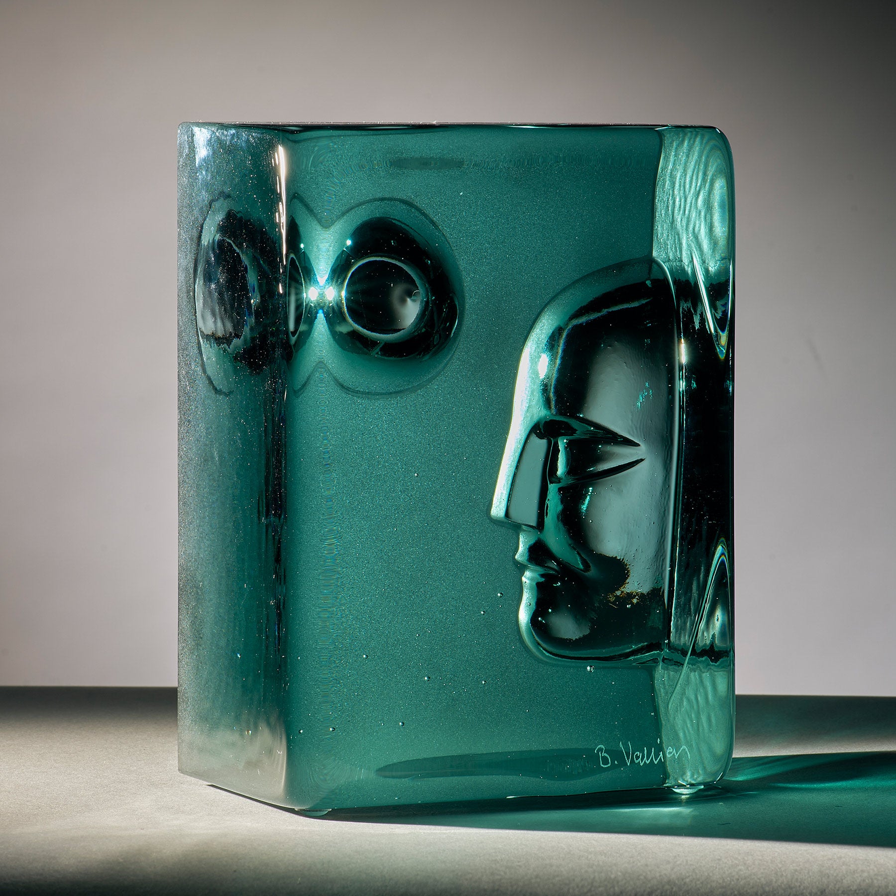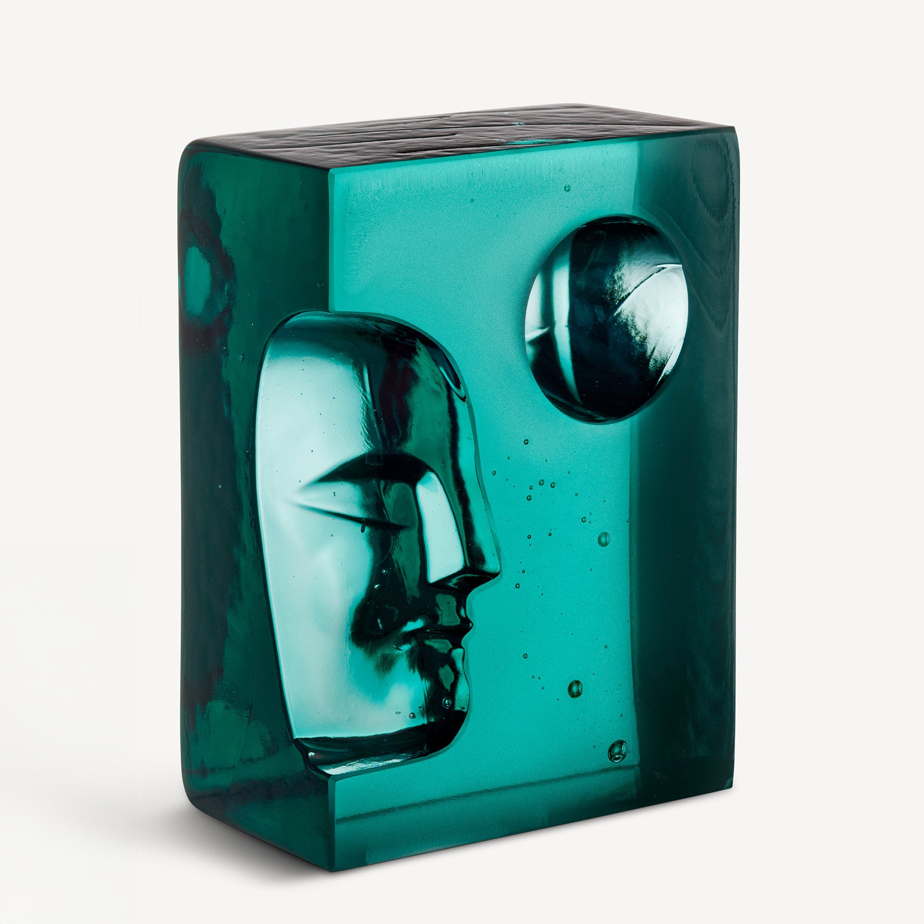 Azur Moon Petrol, by Bertil Vallien, is part of the Kosta Boda Artist Collection. This object in petroleum blue is cast in a graphite mold at Kosta Glassworks. The mold creates an impression of a face bathed in moonlight.
