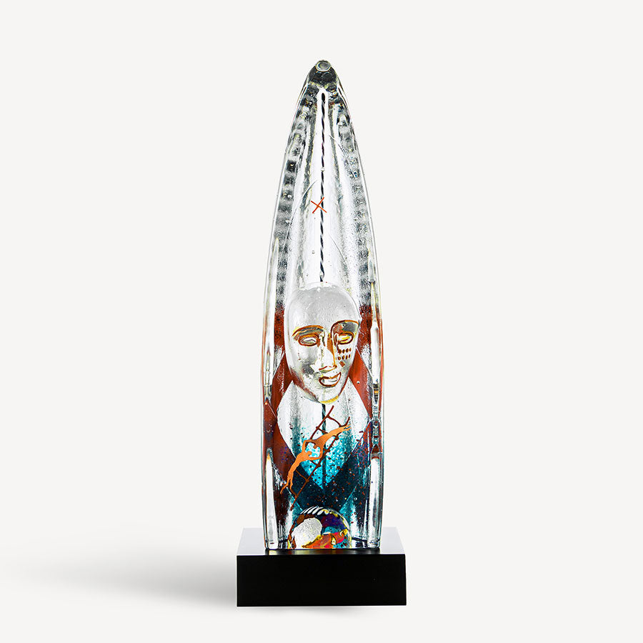 Vertical Journey is a creation by the renowned Swedish glass artist Bertil Vallien who sees the boat as a symbol of freedom and solitude. The boat has become one of his main signatures, recreated in different sizes and forms. Vertical Journey is handmade at Kosta Glassworks in Sweden in clear glass with details such as a hand-painted head and copper figures cast inside. The boat, which is part of the Kosta Boda Artist Collection, stands on a black wooden plinth.