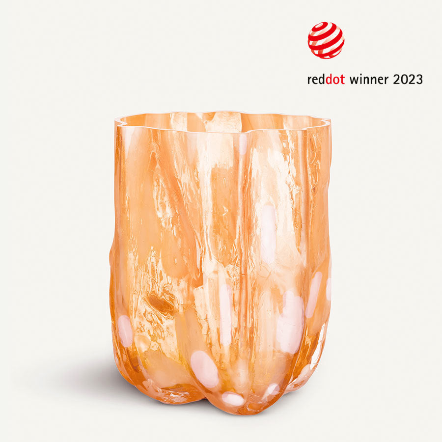 The Crackle collection is a tribute to cracks, beautifully preserved in glass. The tall amber vase with pink elements has a sculptural, expressive exterior created using an old craft technique, where the hot glass is dipped in ice-cold water. Crackle is mouth-blown in Kosta and designed by Åsa Jungnelius.